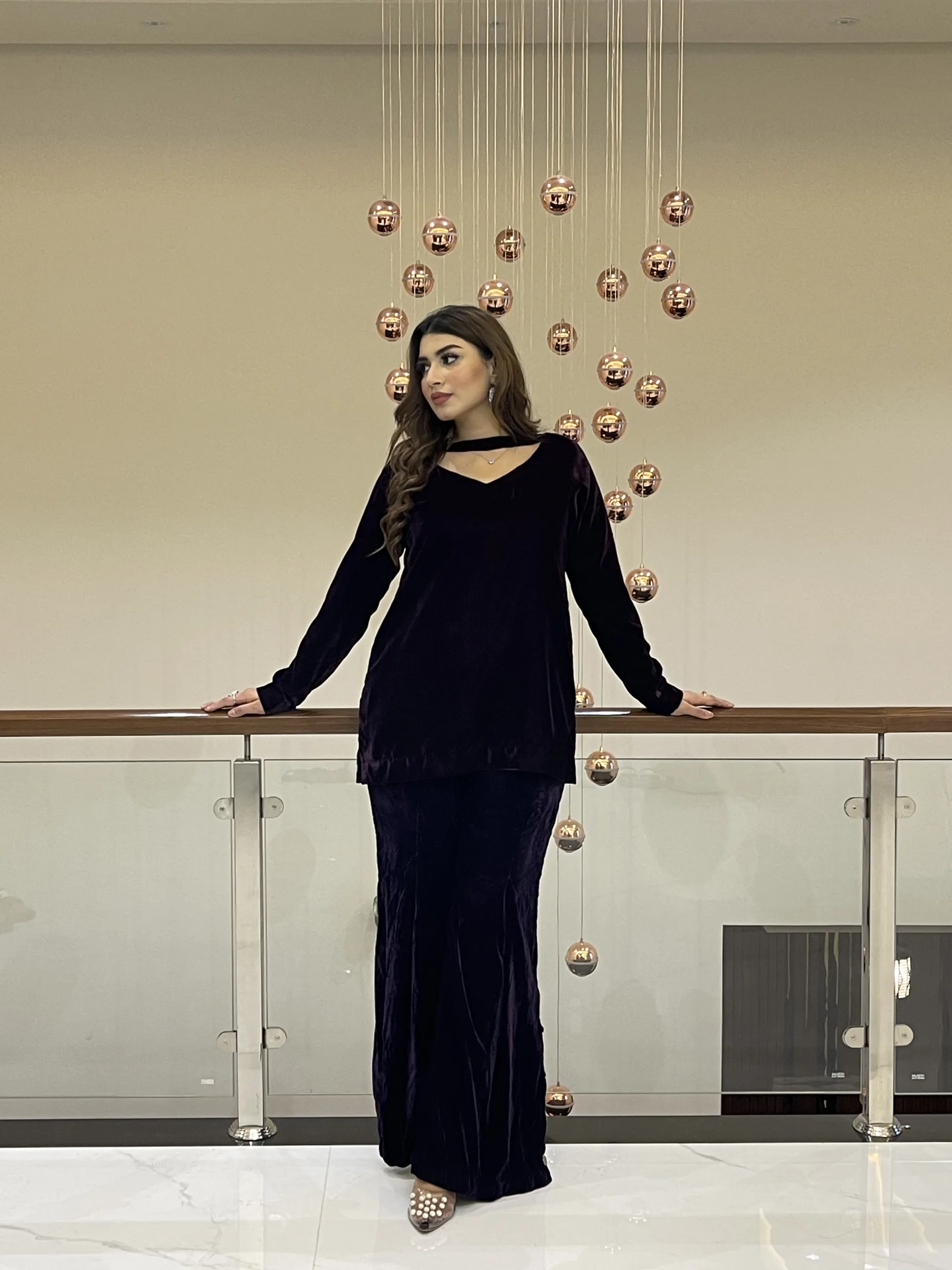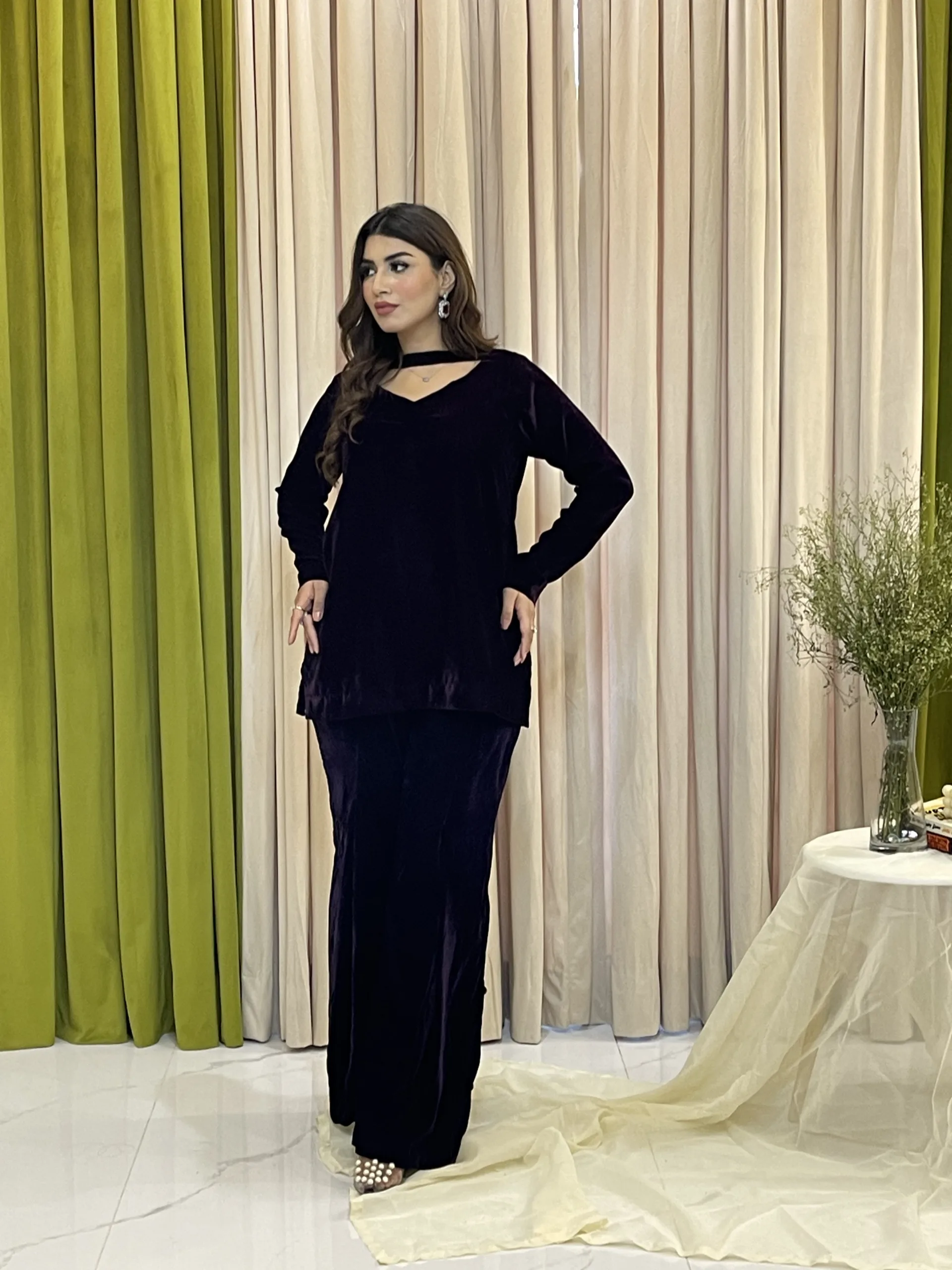 Is two piece velvet outfit which includes short shirt with dramatic neckline and long wide leg trouser.