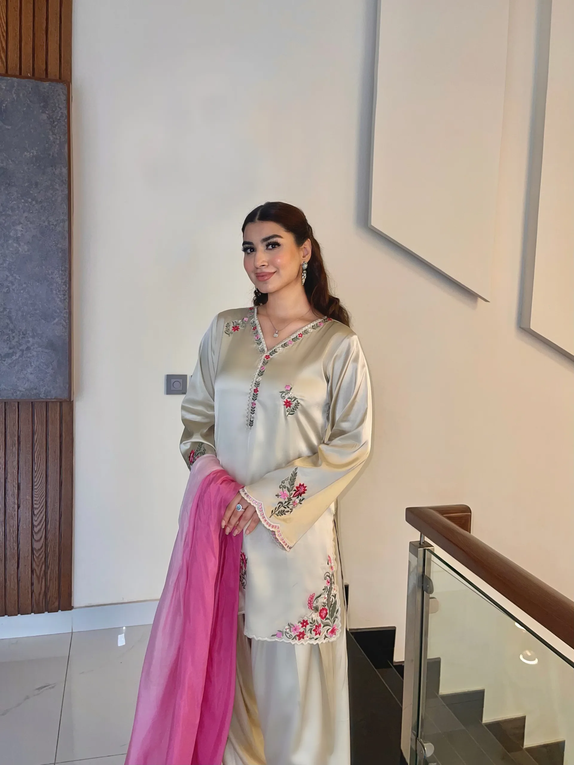 Is a 3-piece outfit which includes silk embroidered shirt with Farshi shalwar and silk dupatta.